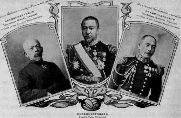 Японские флотоводцы: командующий 3-й эскадрой Соединенного флота вице-адмирал Сичиро Катаока, командующий Соединенным флотом и 1-й эскадрой Соединенного флота адмирал Хейхатиро Того, командующий 2- й эскадрой Соединенного флота вице-адмирал Гиконойто Камимура