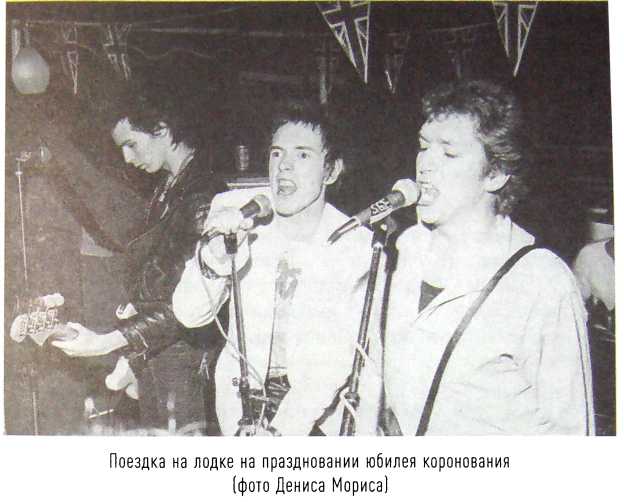 Группа организовала свою собственную вечеринку, посвященную празднованию юбилея коронования. На вечер 7 июня Virgin заказала для группы катер с удачным названием «Королева Елизавета» (а как еще он мог называться?). Его тут же украсили плакатом: «Королева Елизавета приветствует Sex Pistols». Присутствовал цвет панковской тусовки, журналисты музыкальных изданий, телевидение и еще целая толпа прихлебателей, которых пригласили, а затем благополучно оставили на пристани. Нэнси прикатила на вечеринку в компании Сида и Линды Эшби, и Макларену едва удавалось (вот уж действительно подвиг) удерживать эту женщину, которую Роттен тихо ненавидел, на расстоянии вытянутой руки от себя во время проведения официальной части. Анна Беверли также оказалась в числе приглашенных. О мероприятии она сообщила следующее: «Мы должны были собраться на пристани к 7.30, вскоре после назначенного времени отчалили. Многих просто оставили на причале. Сдается мне, запланированно. Малкольм хотел показать, кто тут главный. Ричард Брэнсон предложил мне выпить и спросил про Сида. Все вели себя как обычно, только Нэнси не переставала в присутствии своих друзей называть меня мамой. Видимо, думала, что чем милее она будет, тем больше шансов вытрясти из меня деньги. Группа выступала позже. Сцена была крошечной, да и отыграли ребята совсем немного до того, как нагрянула полиция и электричество вырубили. Катер притянули к берегу и арестовали всех, кто попался под руку. Понятия не имею, чего все добивались, но сама идея этой вечеринки была полным безобразием».