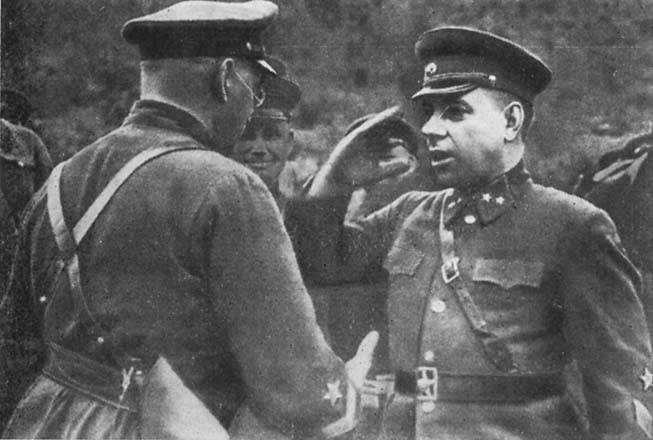 И. Е. Петров вручает Н. И. Крылову орден Красного Знамени. Июнь 1942 г.