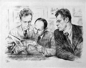 В военные годы, в газетах «Правда» и «Известия», постоянно печатали карикатуры художников Кукрыниксов, Бориса Ефимова,Ираклия Тоидзе. О том, что Кукрыниксы — это не фамилия одного человека, а тройка художников — Михаил Куприянов, Порфирий Крылов и Николай Соколов — работающих вместе, я узнал только после войны, когда поступил в художественную школу на Чудовке. Сатирические плакаты и рисунки в газетах мы ждали наравне со стихами Константина Симонова, Александра Твардовского, Сергея Михалкова, Льва Ошанина. Карикатуры я вырезал и наклеивал в альбом, а чаще срисовывал. Стихи мы с сестрами заучивали наизусть. Арбатская улица была очищена от обломков кирпича и мусора, и по ней, как ни в чем не бывало, ехали автомобили, двигались пешеходы, маршем шли батальоны защитников Москвы навстречу врагу, а в проходных дворах выстраивались длинные очереди: булочные теперь работали с черного хода, отпуская по карточкам хлеб.