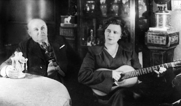 В. Гардин с Т. Булах-Гардиной в квартире на Потемкинской. В руках у Гардина статуэтка работы В. Лишева. 1945 г.