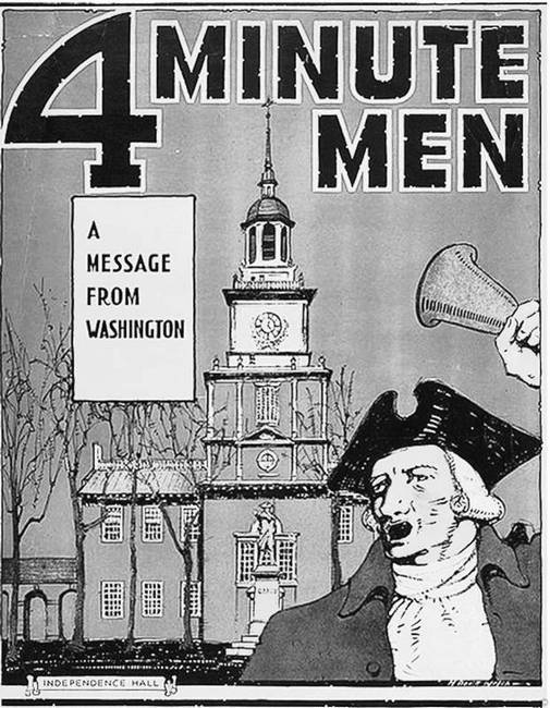 Комитет общественной информации, официальное агентство пропаганды, созданное правительством США во время войны, принял на службу 75 тысяч добровольцев, известных как «четырехминутчики», которые выступали с короткими патриотическими речами по всей стране. Они наводнили страну пропагандой войны и призывали доносить на «тех, кто распространяет пессимистические заявления… призывает к миру или преуменьшает наши усилия одержать победу».