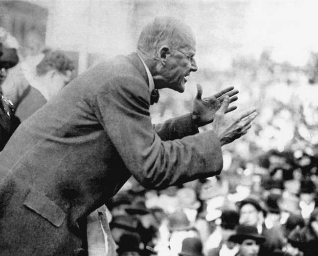 Руководствуясь Законом о борьбе со шпионажем 1917 года, США бросили в тюрьму сотни протестующих против призыва в армию и войны в целом, в том числе лидера ИРМ Хейвуда (Большого Билла) и социалиста Юджина Дебса. Дебс (на снимке он выступает на митинге в Чикаго в 1912 году) призывал рабочих выступить против войны, заявив: «Пусть капиталисты сами сражаются и сами погибают за свои интересы, и тогда на земле больше никогда не будет войн».
