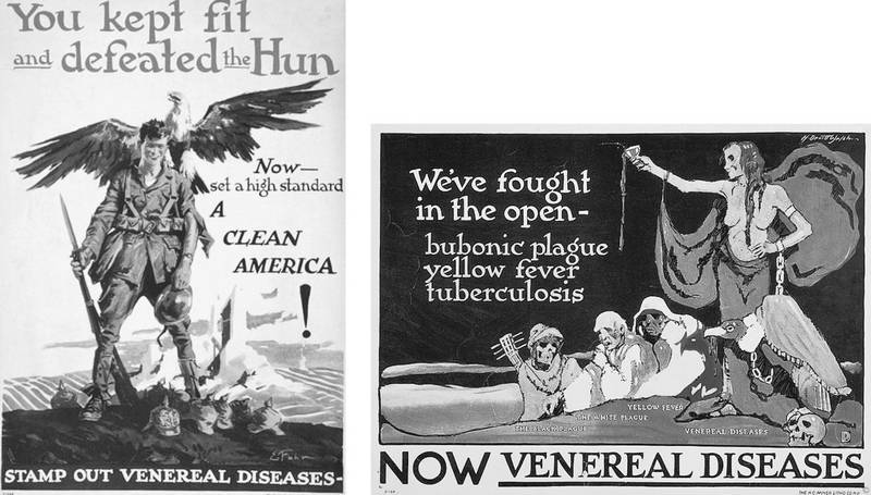 Плакаты периода Первой мировой войны против венерических заболеваний. Комиссия по наблюдению за деятельностью военно-учебных лагерей (КВУЛ) пыталась обуздать мужскую сексуальность с помощью кампании воздержания, подвергая сомнению патриотизм солдат, подхвативших венерическую болезнь.