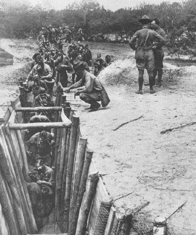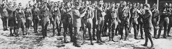 Американские солдаты, проходящие обучение противохимической защите в лагере Дикс, штат Нью-Джерси. Несмотря на то что химическое оружие столетиями находилось под запретом у разных цивилизаций, во время Первой мировой войны оно стало широко применяться. Во время газовых атак люди умирали тысячами.