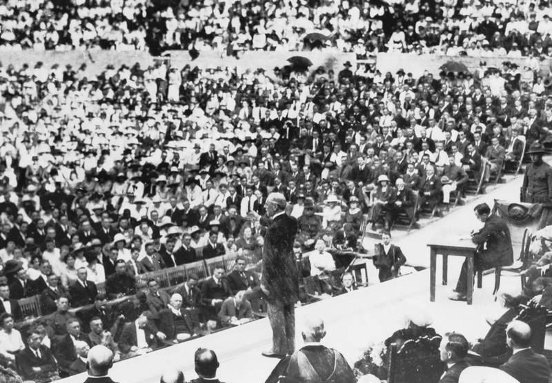 Президент Вудро Вильсон выступает в Греческом театре в Беркли, штат Калифорния, в сентябре 1919 года. Переизбранный президентом в 1916 году благодаря лозунгу «Он не позволил втянуть нас в войну», Вильсон вступил в Первую мировую войну в 1917 году, надеясь добиться участия США в определении судеб послевоенного мира.
