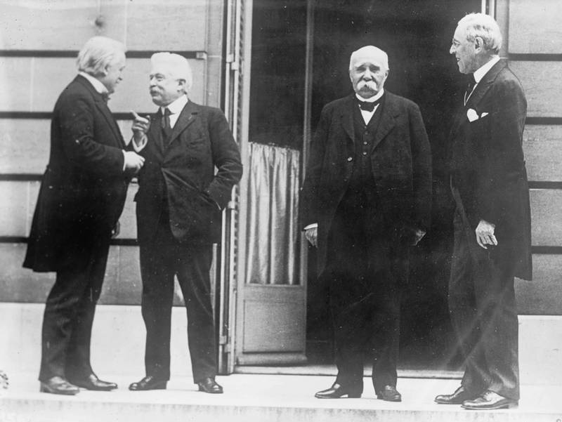 Слева направо: премьер-министр Англии Дэвид Ллойд Джордж, премьер-министр Италии Витторио Орландо, премьер-министр Франции Жорж Клемансо и президент США Вудро Вильсон на Парижской мирной конференции. На конференции бо?льшая часть возвышенных идей «Четырнадцати пунктов» Вильсона была отброшена другими союзниками, искавшими мести, новых колоний и господства на морях в послевоенном мире.