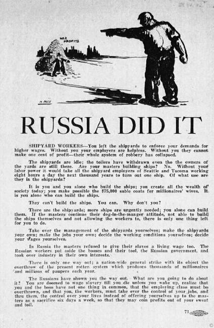 В 1919 году более 4 миллионов американских рабочих боролись за повышение заработной платы, улучшение условий труда и право организовываться в профсоюзы. Как видно из этой листовки, выпущенной в честь всеобщей забастовки в Сиэтле, русская революция помогла воспитать в рабочих боевой дух.