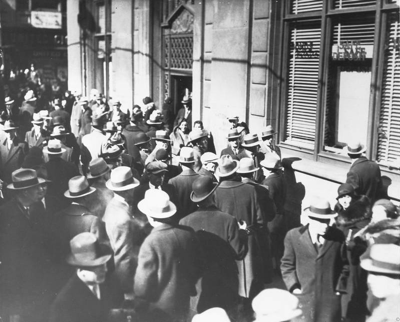 «Набег на банк», февраль 1933 года. В период с 1930 по 1932 год обанкротился каждый пятый банк в США. К моменту инаугурации Рузвельта деятельность банков была полностью заморожена или по меньшей мере серьезно ограничена по всей стране.