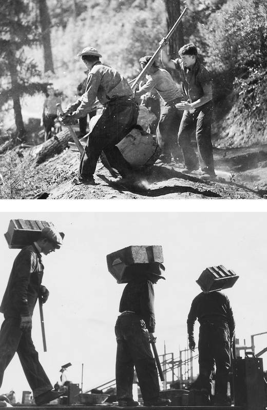 Трудовой отряд Гражданского корпуса охраны природных ресурсов за работой в национальном лесу Бойз, штат Айдахо. По распоряжению Управления общественных работ (УОР) рабочие носят кирпичи для постройки новой средней школы в штате Нью-Джерси. Создание Гражданского корпуса охраны природных ресурсов и УОР было частью весьма амбициозного плана по восстановлению экономики, предложенного Рузвельтом уже в первые сто дней после вступления в должность.
