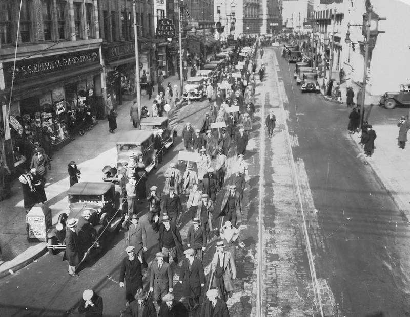 Марш протеста безработных в Камдене, штат Нью-Джерси. В 1934 году произошли всеобщие забастовки в Толедо, Миннеаполисе и Сан-Франциско, за ними последовала знаменитая стачка текстильщиков, после чего рабочие стали искать поддержки у радикальных групп. Безработные поддержали бастующих, отказавшись стать штрейкбрехерами.