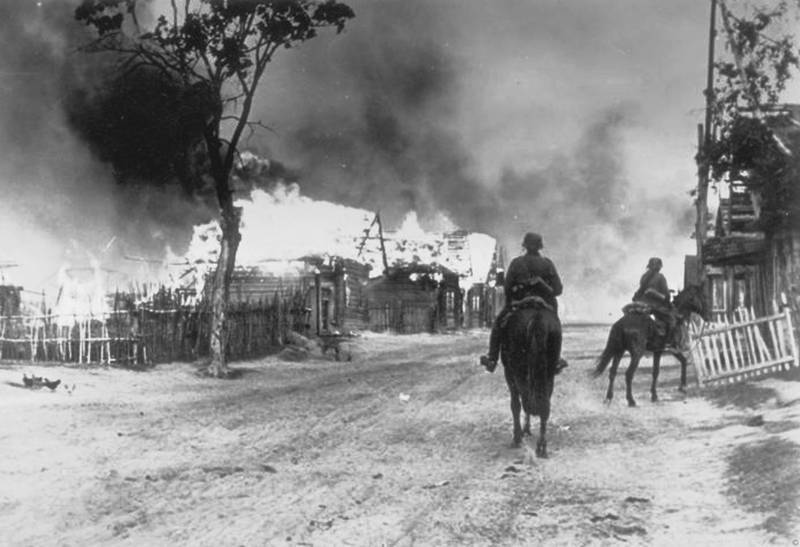 Немецкая кавалерия покидает охваченную огнем русскую деревню в ходе операции «Барбаросса» – широкомасштабного вторжения Германии в СССР в июне 1941 года.