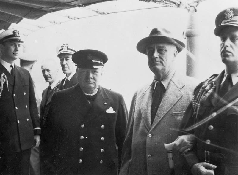 Черчилль и Рузвельт на борту линкора «Принц Уэльский» во время встречи, посвященной подписанию Атлантической хартии (август 1941 года). Принимая положения данной декларации, Великобритания и США отказывались от империалистических притязаний и призывали к установлению самоуправления и разоружению. Однако, опасаясь, что формулировки, предложенные Рузвельтом, не будут отвечать колониальным интересам Британии, Черчилль включил в хартию пункт, согласно которому равный доступ к международному богатству будет предоставляться лишь «с должным уважением… к существующим обязательствам».
