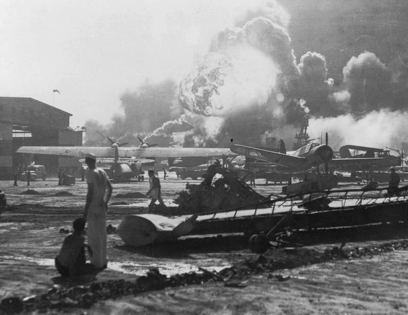 Американская военно-морская база Перл-Харбор во время японской бомбардировки 7 декабря 1941 года.