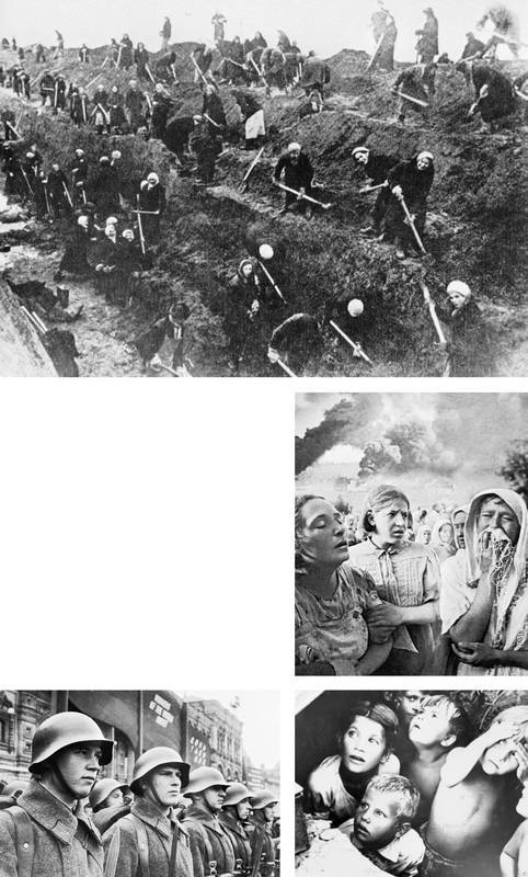 Американские обозреватели неустанно восхваляли героическую борьбу солдат Красной армии и всего советского народа против немецких захватчиков. На иллюстрациях (по часовой стрелке): женщины и старики роют противотанковые рвы, чтобы сдержать немецкое наступление на Москву; отчаявшиеся женщины перед наступлением немцев на Киев (Украина); испуганные дети в киевском бомбоубежище во время немецкой бомбардировки; солдаты Красной армии.