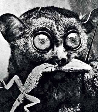 Свет и цвет… Все ли животные одинаково хорошо воспринимают цвет? Оказывается, нет. Дно глаза, мы знаем, выстлано сетчаткой, представляющей под микроскопом скопление «палочек» и «колбочек». «Палочки» очень чувствительны. Они улавливают мельчайшие частицы света, попадающие в глаза, например, тех же сов, лемуров, в глаза вот этого долгопята, поймавшего ящерицу, а также кошек. «Палочки» цвета не воспринимают, он ведь в сумерках все равно неразличим. Зато там, где мы видим только два светящихся глаза кошки, сама кошка видит бегущую мышь. Еще более чувствительны глаза сов и всех ночных хищников. Они видят в призрачном свете звезд и луны. И только в темноте совершенной полагаются лишь на слух. Значит, кошке безразлично, какой телевизор смотреть – черно-белый или цветной? Не совсем. Кошка – охотник сумеречный. Но мышь она поймает и днем. У нее хорошо активизированы и «палочки», и «колбочки». Стало быть, жизнь для нашего прирученного мышелова далеко не бесцветна. Но чтобы излишне не раздражались, не ослеплялись чувствительные «палочки», зрачок у кошки, понаблюдайте, подвижен. Он действует подобно диафрагме в фотографическом объективе: избыток света сужением зрачка не пропускается в глаз.