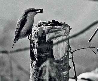 Лет пятнадцать назад осенью я работал у друга в лесной избе и задумал привлечь в дуплянку для фотосъемки парочку белок, живших в лесу по соседству. По верхней жерди ограды разложил я лесные орехи. Насыпал орехов также в дуплянку. И дело пошло на лад – приманка была замечена. Но вдруг помеха – откуда-то появившийся поползень. С неутомимой поспешностью он взялся таскать орехи. Я подкладываю – он уносит. Но поединок я обратил в свою пользу. Проследив полеты воришки, обнаружил орехи между бревнами дома, в щелях колодезного сруба, в трещинах старой лодки. Без большого труда я собрал все ворованное и пустил снова в дело. Ничуть не смущаясь, поползень продолжал азартное воровство, пряча орехи все в тех же местах. Игра продолжалась дня три. Я сделал снимки белок и поползня. Причем птица настолько освоилась, что стала хватать орехи прямо из рук.