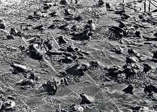 Следуя за лягушками, мы такой бочажок сразу и обнаружили. При взгляде с обрыва у речки весь он был в темных пупырышках, и исходившие от него звуки напоминали бег воды по камням. Подойдя к бочажку, мы увидели: весь он кишит лягушками. Дымчато-голубые самцы, наполовину высунувшись из воды, пели, точнее сказать, икали от страсти, призывая из леса в бочажок самок. Но коллективное это иканье было приятно для слуха и, уж конечно, сводило с ума соплеменников, спешивших сюда из леса.