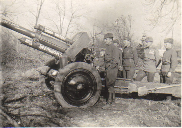 Мой двоюродный брат Михаил Бенцианович Качан (стоит на переднем плане). На пушке написано: «На Берлин!»