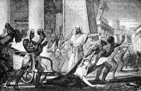 «…Когда она возвращалась откуда-то домой, они стащили её с носилок и привлекли к церкви, называемой Кесарион, потом, обнажив её, умертвили черепками, разорвали на части, а куски тела снесли на место, называемое Кинарон, и там сожгли…»