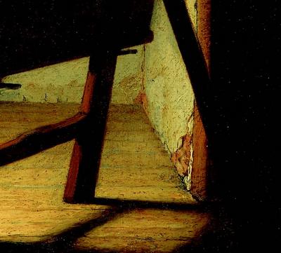 Таким образом, в сердце загадки – господствующая над всей композицией дубовая доска, одновременно видимая и таимая, массивная и осязаемая (ее тень падает на пол, словно не давая проникнуть в мир картины) и все же неуловимая, ускользающая. Как и все материальные предметы на картине, фактура которых тщательно прописана: дощатый пол, осыпающаяся штукатурка, мольберт с его штифтами и отверстиями, – деревянная доска изображена во всех подробностях. Поначалу кажется нелепой причудой, что Рембрандт с особым тщанием выписал никому не интересную заднюю сторону доски: продольные неровности на дереве, снятые фаской края, причем один из них, обращенный к зрителю, ярко освещен, словно он вобрал все лучи солнца, падающего из окна, которое, как можно догадаться, расположено слева.