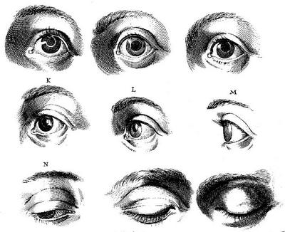 «великого искусства требует изображение Ока, дающего, либо матовостию и тусклостию своей, либо живостию выражения, представление о самом душевном строе своего обладателя… Примером сего может служить графический портрет шута или идиота, характер коего художник показывает посредством прищуренных глаз, морщинок, расходящихся от смеха от уголков оных к вискам, а также рта, столь широко разинутого от смеха, что виднеются зубы. Напротив, достойного, богобоязненного отца семейства должно изображать с выражением лица одновременно возвышенным и смиренным, и на созерцателя он должен устремлять взор торжественный и строгий, коего художнику надобно добиваться, закрывая верхним веком бо?льшую часть глазного яблока. Таковой взор есть свидетельство сдержанности и трезвости натуры…»[40]