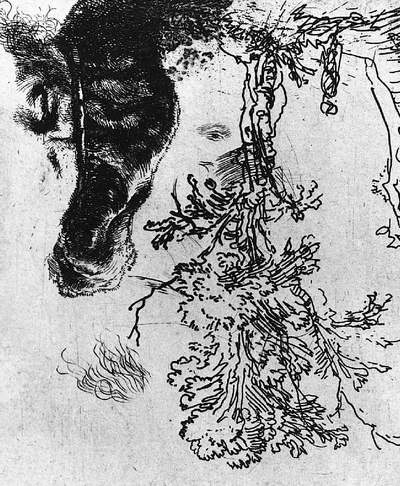 Рембрандт ван Рейн. Лист с этюдами дерева и глаза и неоконченным автопортретом (перевернут, чтобы отчетливее показать глаз). Ок. 1642. Офорт. Музей Метрополитен, Нью-Йорк