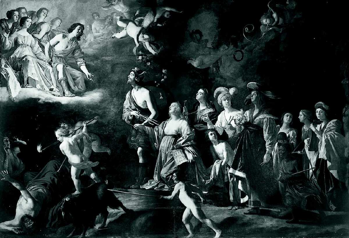 В гаагской лавке Хондиуса предлагался целый ассортимент гравированных репродукций великих работ мастеров Северной Европы: Гольбейна, Дюрера, Брейгеля, – и там Гюйгенс мог листать альбомы и играть в художественного критика. Хотя Жак де Гейн II не пожелал стать его наставником, Гюйгенс подружился, тем более что они жили по соседству, с его сыном, Жаком де Гейном III, которому судьба также судила поприще художника, пусть и не плодовитого. Выходит, что с ранних лет Гюйгенс был окружен визуальными образами, будь то картины, рисунки, гравюры, и с готовностью подписался бы под трюизмом, что искусства-де составляют славу Нидерландов и их следует всячески беречь, развивать и поощрять. Недаром Хондуис опубликовал аллегорическую гравюру, призванную представлять счастливое состояние Нидерландов, на которой художник, под сенью пальмы – символа воинских побед, что-то рисует в кругу свободных искусств, тем самым внося свой вклад в дело процветания суверенной республики[17].