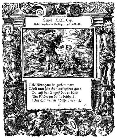 Тобиас Штиммер. Жертвоприношение Авраама. Гравюра на дереве из цикла «Библейская история в новых образах». Базель, 1576. Колумбийский университет, библиотека Эйвери, Нью-Йорк