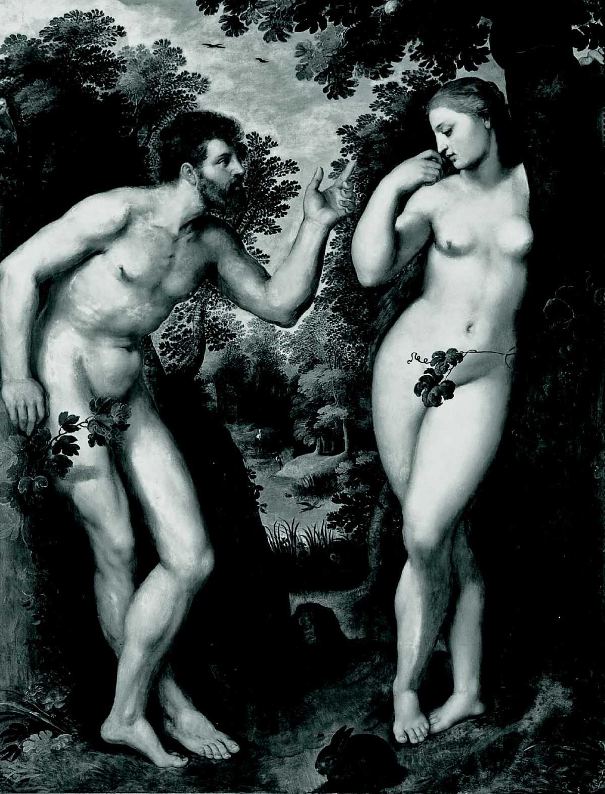 Подражательность Рубенса прежде всего заметна в его версии «Грехопадения», написанной по мотивам гравюры Маркантонио Раймонди с рисунка Рафаэля. Рубенс точно воспроизводит позы, избранные Рафаэлем. Однако, словно бы следуя рекомендациям Лампсония, добавляет детали, заимствованные у тех жанров, что, как принято было считать, особенно удаются нидерландцам: у пейзажной и портретной живописи. Вместо бегло очерченного, стилизованного Эдема Рубенс разбивает на картине настоящий райский сад, с вездесущей эмблемой плодовитости – кроликом и с целым ботаническим и орнитологическим арсеналом, свидетельствующим о страсти фламандцев к естествознанию. В конце концов, изображение творящей природы, «natura naturans», по словам Леонардо, демонстрирует почти божественную власть художника.