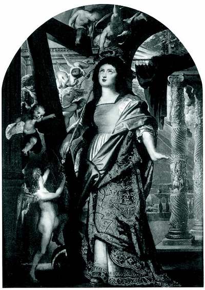 Теперь Рубенс непосредственно применил на практике столь долго накапливаемые знания и умения. Возможно, оттого, что он слишком тщательно и добросовестно воспроизвел на одной картине все аллюзии и отсылки к этому событию христианской истории, все его известные детали (и не сумел вообразить данную сцену как органическое целое), она кажется нагромождением подробностей, а не стройной композицией. Фигура святой Елены, напоминающая «Святую Цецилию» Рафаэля, была в значительной мере скопирована с античной скульптуры, которую Рубенс обнаружил в развалинах Сессория и которая изображала римскую матрону, к вящему удобству живописца овеянную благочестивой славой: согласно легенде, она приняла христианство и потому тотчас же стала почитаться истово верующими. Облаченная в приличествующие случаю одеяния, одновременно, как пристало христианке, скромные и вместе с тем не лишенные аристократической пышности, святая Елена стоит возле Триумфальной арки, держа в руке скипетр, знак императорской власти. И арка, и скипетр символизируют победу новой веры над языческой религией прежней империи, детали особенно знаменательные в церкви Святого Креста, ведь она была возведена на руинах Сессория, бывшей виллы императора Септимия Севера. Учитель Филиппа Рубенса Юст Липсий опубликовал трактат «О Кресте» («De Cruce»), провозглашающий культ Святого Креста как символа искупления людских грехов, а запрестольный образ кисти Питера Пауля продолжал традицию, согласно которой именно эта церковь явилась местом, где язычество было искуплено принятием новой веры. Правой рукой Елена, мать императора, опирается на огромный крест, вокруг коего резвятся путти – кто с монаршей державой в ручках, кто с предметами, откопанными ею в Иерусалиме: терновым венцом или табличкой, прибитой над головой Спасителя. Рубенс явно впервые осознал всю важность соотношения запрестольного образа и его непосредственного архитектурного окружения. Не случайно он «обрубает» крест, словно указывая созерцателю, что тот выходит за пределы пространства картины на потолок церкви, где воспроизведен вторично, уже в мозаике. Туда же, к этому невидимому навершию креста, устремлены возведенные горе очи Елены. На заднем плане и слева от святой витые «соломоновы столпы», украшенные виноградной лозой и, по легенде, повторявшие очертания столпов Иерусалимского храма (несколько якобы подлинных экземпляров которых находились в соборе Святого Петра), подчеркивают связь древнего Святого града и нового.
