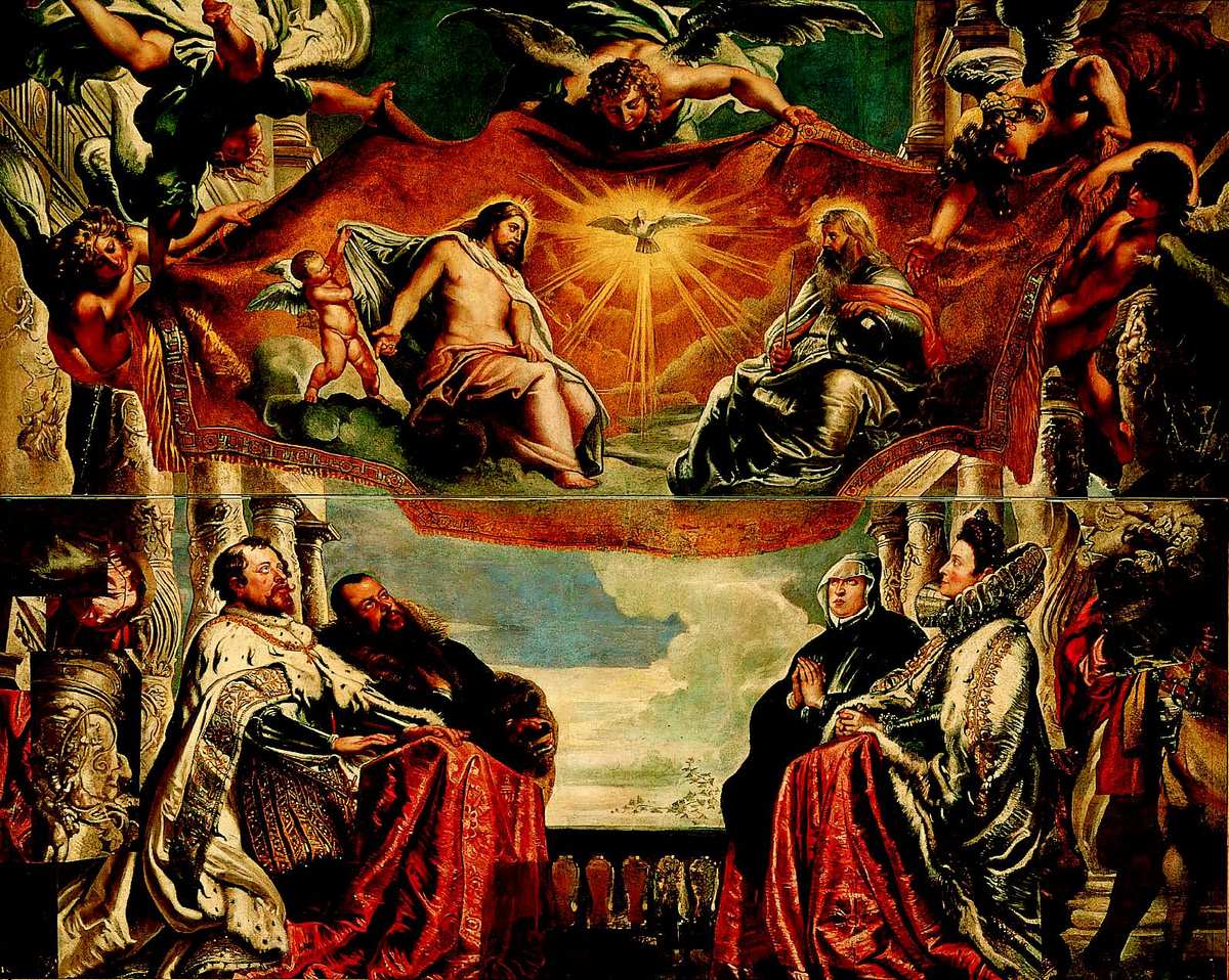 Разумеется, создать атмосферу благочестия вокруг такого семейства, как Гонзага, было непросто. В работе над картиной Рубенс опирался на венецианскую традицию, согласно которой дожа и его близких часто изображали в роли донаторов в одном визуальном пространстве со святыми или даже с Девой Марией, а композицию скопировал с великого портрета семейства Вендрамин кисти Тициана. Однако венецианцы обрели печальную известность своим пренебрежением христианской догмой, а Тридентский собор сформулировал строжайшие принципы, касающиеся изображения небесных видений, а также общения смертных и божественных персонажей в пространстве одной картины. В частности, Тридентский собор объявил, что видения Троицы могут быть дарованы лишь святым и апостолам, к каковым, мягко говоря, нельзя было причислить представителей семейств Гонзага и Медичи, даже искренне набожную Элеонору Габсбургскую, мать Винченцо. Однако картина Рубенса предназначалась для церкви Сантиссима Тринита, Святой Троицы, а по очевидным причинам Винченцо страстно желал предстать в глазах общества покровителем мантуанских иезуитов. Поэтому искать хитроумное решение он предоставил Рубенсу, к 1604 году уже признанному мастеру исторического жанра, наделенному богатым воображением. И Рубенс нашел выход: Бог Отец, Бог Сын и Бог Дух Святой представлены словно бы на шпалере или гобелене, и потому семейство Гонзага преклоняет колени не перед самой Святой Троицей, а перед ее изображением, которое чудесным образом точно оживает на поверхности ткани. В этой картине Рубенс обратился и к другой местной традиции, вспомнив о фламандских шпалерах, не знающих себе равных ни в Северной, ни в Южной Европе по великолепию и яркости. Однако образы Святой Троицы отнюдь не кажутся «ткаными» или сколько-нибудь условными: они созданы из плоти и столь же телесны, сколь и земные донаторы, вот разве что лики их сияют, как и пристало божественным сущностям. Этим блестящим вдохновенным приемом, «ingenium», Рубенс тактично разделил смертный и нетленный миры, одновременно показав, что разницы между презренным ремесленным искусством ткачества и возвышенным искусством живописи не существует. Именно она, по мнению Микеланджело и Вазари, отличала и всегда будет отличать фламандского «кустаря» от итальянского художника, усердный, но туповатый труд от благородного вдохновения, и не в последний раз Рубенс торжествующе развеял этот предрассудок.