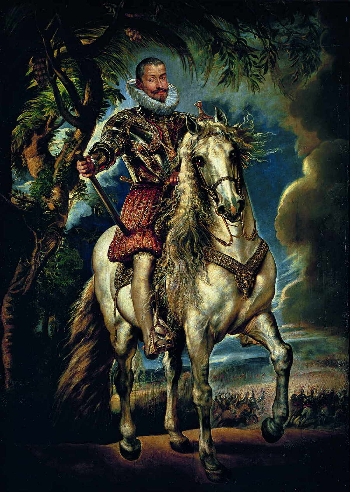 Как это будет впоследствии со всеми этюдами на тему «Великолепного коня», Рубенсу пришлось учитывать обстановку, в которой герцог намеревался разместить портрет. В данном случае ему отводилось почетнейшее место в герцогском доме, в торце галереи, высоко под потолком; он был призван затмить все остальные картины, а посетители взирали на него снизу, исполненные благоговейного трепета, словно в присутствии всевластного Цезаря. Уже завершая работу над картиной, возможно осенью 1603 года, в пригородном особняке графа в Вентосилье, Рубенс увеличил ее площадь, добавив дополнительные фрагменты холста, чтобы разместить еще один пример своего рода визуальной риторики – изображение пальмы и оливы, эмблематически представляющих соответственно победу и мир, с которыми жаждал ассоциировать себя герцог. Подобно тому как он делал это в «Грехопадении» и «Демокрите и Гераклите», Рубенс вписывает эти деревья в пейзаж весьма хитроумно, подчеркивая с их помощью детали облика герцога: мощная ветвь повторяет очертания его сильного правого плеча, а пальмовый лист осеняет его чело, словно нимб христианского святого. Даже освещение гениально служит делу пропаганды: грозовые тучи войны расступаются, словно театральный занавес, и на главу героя, на его превосходного скакуна изливается сияющий свет.