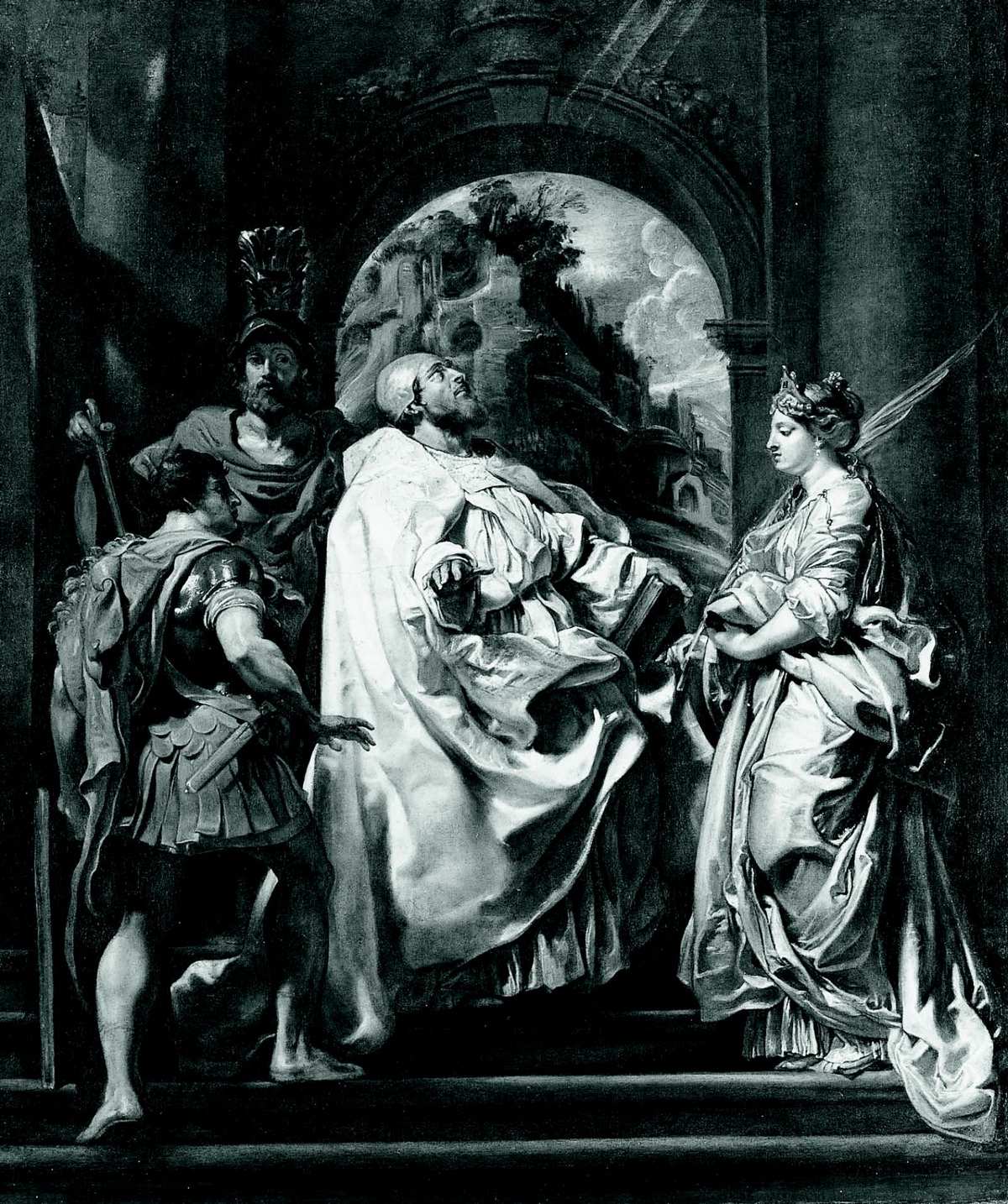 Хотя исторических персонажей, собравшихся на ступенях лестницы перед классической аркой, в реальности разделяло по меньшей мере триста лет, Рубенс объединил их, превратив в свидетелей важнейшего события: на глазах у них Рим отринул власть язычества и обратился в спасительную христианскую веру. Арка обрамляет вид на руины Палатина и маленькую церковь Святого Теодора (Сан-Теодоро), на протяжении веков считавшуюся местом первых христианских мученичеств. По левую руку Григория стоит облаченная в пышные сиренево-серые шелка Флавия Домицилла, родственница императора Домициана, во II веке, на исходе Римской империи, сожженная на костре за отказ принести жертву языческим богам и идолам. Двое мужчин в роскошном вооружении – это святой Мавр и святой Папиан, из числа первых христианских мучеников. Впрочем, они также напоминают святых, особенно почитаемых Баронием и ораторианцами, – евнухов Домициллы Ахиллея и Нерея. Оба они были воинами, затем приняли христианство и обрекли себя на муки, а их мощи покоились на кладбище Домициллы[149].