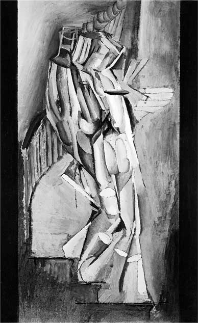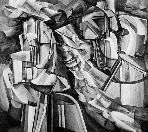 Переход от постимпрессионизма к тому, что Дюшан называл «элементарным параллелизмом», произошел в 1911 году в таких работах, как «Грустный молодой человек в поезде» (Фонд Соломона Р. Гуггенхайма, коллекция Пегги Гуггенхайм, Венеция) – автопортрете Марселя на пути в Руан, куда он отправился с целью навестить родителей, которые теперь проживали на улице Жанны д’Арк, напротив Музея изящных искусств[23]. Фрагменты совершенно нераспознаваемого лица развернуты по всей ширине полотна, производя эффект раскачивающегося на ходу поезда: «Прежде всего – идея движения поезда, затем – идея грустного молодого человека, который сидит внутри и едет; таким образом, есть два параллельных аналогичных движения»[24]. Дюшан утверждал, что в первую очередь это «формальная декомпозиция». Однако в ней также можно увидеть метафору трансформации, происходящей в молодом человеке, который постепенно обнаруживает свой путь и свой независимый дух.