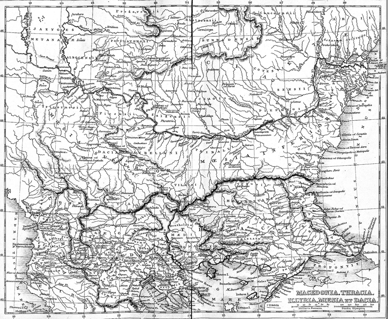 Древняя Македония и соседние территории – Иллирия, Мёзия, Фракия и Дакия в римские времена. Карта из атласа Alexander G. Findlay. Classical Atlas to Illustrate Ancient Geography. 1849 г.