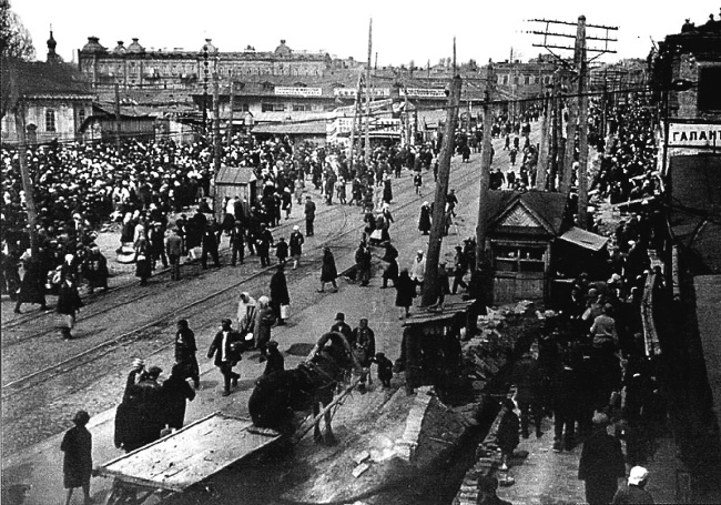 Вообще же район рынка был уникален превде всего невероятной мешаниной национальностей, языков, традиций… В разгар нэпа в Киеве, как и повсюду, появились национальные криминальные группировки, состоявшие из сотен и даже тысяч земляков: китайская мафия среди прочего контролировала разлив и продажу контрабандной водки, в том числе на Евбазе… Припоминается сплошное болото или пыль под ногами – в зависимости от состояния погоды, – беспрестанная людская толкучка и шум, выкрики из толпы: “Марь-Ванна, наливай!” – разносчика питьевой воды с сулеей[4] на плече и со стаканом в руке. Китайцы (из тех, кто завербовался на заработки в Россию еще во время Первой мировой войны) – продавцы разноцветных фонариков из гофрированной бумаги, легких серебристых шариков на ниточке-резинке, черных бегающих мышей. Гадалки на картах непременно пророчили если не “дальнюю дорогу”, то “казенный дом” или пикового короля. Ученая морская свинка вытягивала бумажку-пророчество “с судьбой”… А в 1932–1933 годы Евбаз был одним из тех мест, где массово гибли люди, ища и не находя спасения от голодной смерти[5]. С переводом в 1934 году столицы УССР из Харькова в Киев власть пыталась упорядочить Евбаз по-своему. Начали с уничтожения церкви “в связи с реконструкцией площади и удобного устройства на ней трамвайных путей”. Потом соорудили помпезные деревянные пилоны главного входа на колхозный рынок. Но это был лишь внешний лоск. Официально беспризорников при «Советах» не существовало. Но фотографии Галицкой площади, датированные 1935 годом, навеки запечатлели ободранных босоногих пацанят».