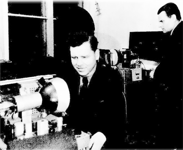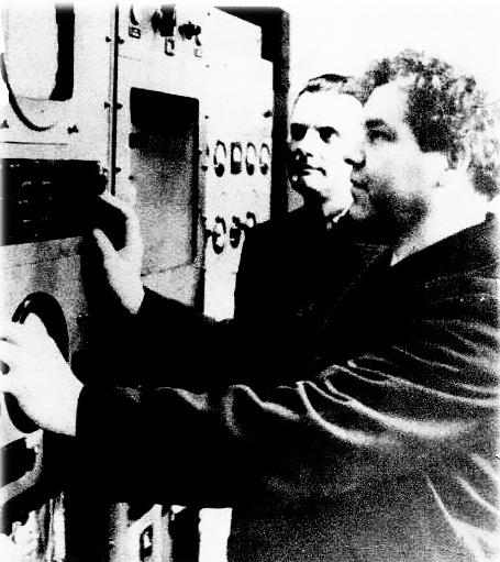 В.Е. Назаренко и А.С. Квач проводят экспериментальную передачу для станции СП-6. 1957 г.