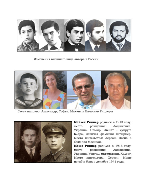 Нас было четверо детей: Саша (1937), Софья, или Соня (1942), я и Вячеслав, или Слава (1949). Саша, к сожалению, умер от тяжелой болезни в подростковом возрасте. Соня стала замечательным детским врачом и заслуженным врачом России. А Слава преуспел в математике, окончил педагогический институт в Хабаровске, аспирантуру в Воронежском университете, защитил кандидатскую диссертацию, заведовал кафедрой математики в пединституте. Я ими всегда гордился. Соня и Слава живут в Израиле, имеют собственные семьи, детей, жизнерадостных внуков и внучек. Их личные истории заслуживают отдельной книги.
