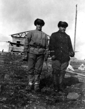 Наконец 17 августа около 5 ч дня на горизонте показался остров Диксон. Очень скоро мы увидели громадную мачту беспроволочного телеграфа, а в 7 ч вечера начали входить в пролив между островом и берегом. Около 8 ч стали на якорь. Здесь находились пароход «Туруханск» и три лихтера. Еще мы не успели стать на якорь, как подошел мотор, в котором были доктор Кушаков, лейтенант Транзе, еще кто-то и матрос. Я тут же догадался, который из них был Кушаков, хотя его никогда в глаза не видал. Сначала они вышли на «Таймыр», а потом приехали к нам. Неизвестный оказался молодым астрономом[108]. Доктор Кушаков – безусловно, интересный тип и, по-видимому, большой молодец, т. к. только благодаря ему удалось спасти остатки экспедиции Седова. Посидел он у нас довольно долго и потом пригласил к себе ужинать. За ужином мы после долгого перерыва первый раз ели настоящее свежее мясо и много всевозможных закусок. Гостеприимный хозяин сообщил нам последние новости о войне, а также много рассказывал про свой поход. Затем он показал нам свое хозяйство. Осмотрели радиостанцию: она звуковая, в 15 киловатт, станционная башня в 100 метров высотой. Великолепная баня и очень хорошие жилые дома.