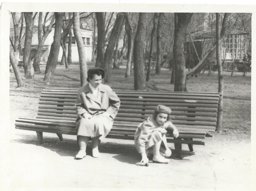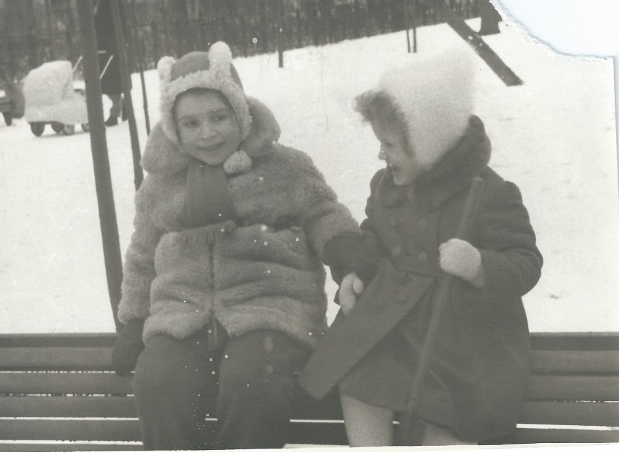 Вот этот снимок тоже сделан в сквере, достаточно посмотреть за наши с подружкой спины и спинку скамейки. Это зима шестьдесят первого года, на заднем плане тогдашняя детская коляска, низенькая, чтобы дитя не выпало с высоты.