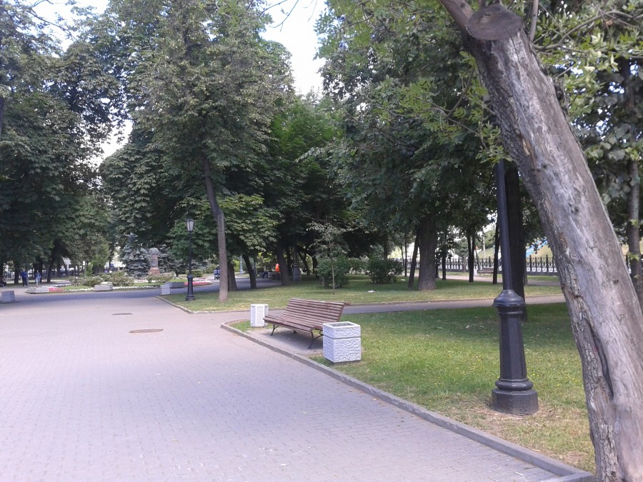 Помню с тех времен, как готовили место под памятник маршалу Толбухину – сначала насыпали холмик на том месте, где теперь клумба, и оставили на зиму. Взрослые гадали в разговорах, что бы это могло быть – клумба, основание для беседки или что-то еще. А мы катались с холмика на санках всю зиму, пока весной не поставили на это место памятник маршалу. Меня, помню, очень удивляло, что в руке у него перчатки – мне казалось, что в руке у него должно быть, как у всех других памятников военным, либо оружие, либо вообще ничего. Но автор распорядился именно так. Потом, как мне кажется, памятник сдвинули, и постамент у него, хоть и приподнятый, но намного ниже, чем был, а клумба теперь плоская.