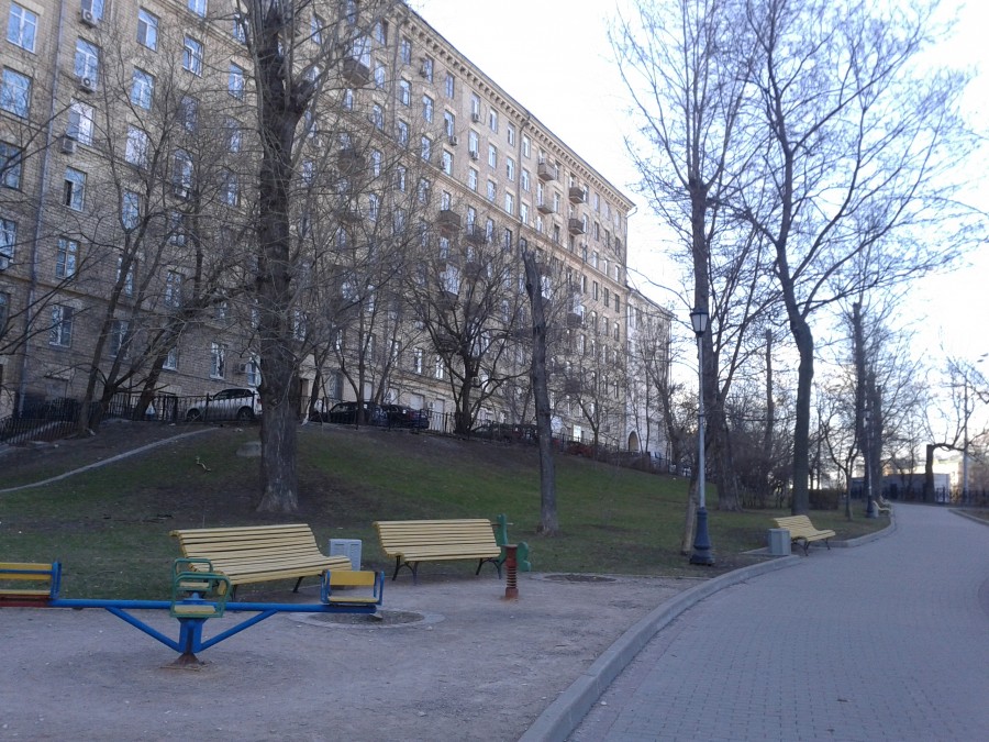 С самого начала, то есть во времена моего детства, сквер был такой, как теперь. Только у входа, где теперь свободное место, торжественно возвышалось нечто мемориально-триумфальное, большая арка в классическом стиле, напоминающая ту, что на Кутузовском проспекте. Вокруг нее была небольшая площадь, побольше, чем теперь, потому что Садовое кольцо теперь стало намного шире. Первого мая (девятое тогда еще не было выходным) на этой площади было гулянье, торговля мороженым, шариками и кустарными игрушками. Игрушками торговали мастера из кооперативов (тогда тоже были кооперативы, но мало), которые их делали, и были это искалеченные войной люди – без ног, с одной рукой, сидящие на самодельных креслах с колесиками или тележках. Отец всегда покупал мне какие-нибудь игрушки у них: прыгающий шарик на резиночке, обтянутый разноцветной фольгой, или бегающую мышку с катушкой и резинкой внутри – вытянешь сверху ниточку с катушки, и катушка закрутит резинку, а отпустишь, и резинка раскручивается, втягивает нитку и катится, а мышка бежит, как живая. Фотографий арки у меня не осталось, и в интернете я не нашла.
