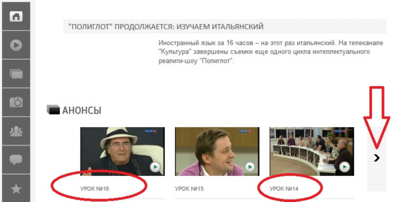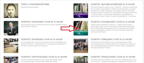 Перед вами открываются передачи, название которых начинается на букву «п». Прокручиваете вниз и находите передачу «Полиглот» по тому языку, который вам нужен.