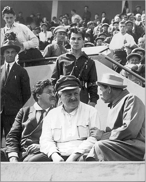 Слева направо: Е.М. Ярославский, секретарь ЦИК СССР А.С. Енукидзе, А.М. Горький