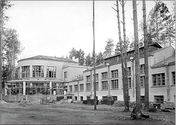 Проект клинического санатория разработал архитектор Б.М. Иофан (28.04.1891—11.03.1976), а местом строительства, по решению Политбюро ЦК ВКП(б), была выбрана территория заповедного леса рядом с деревней Барвиха, расположенного в Звенигородском районе Московской области. Начало стройки, судя по имеющимся документам в фондах ГА РФ, можно отнести к октябрю 1930 года, когда уже была выполнена топосъемка участка местности и на основе технического задания создан проект клинического санатория – достаточно унылого, серого четырехэтажного здания в стиле конструктивизма. Строительство велось почти 3,5 года, и еще год ушел на отделку внутренних помещений и размещение диагностического медоборудования, кстати закупленного в Швеции и Германии. Здание санатория «Барвиха» – кирпичное с железобетонным каркасом и перекрытиями. Состоит из отдельных двух- и трехэтажных корпусов-павильонов, объединенных крытыми переходами и галереями. Из шести корпусов – три предназначаются для палат и стационара, в остальных располагаются общественные помещения, в том числе крытый теннисный и физкультурный зал площадью 450 кв. м. Первый двухэтажный корпус предназначен для двухкомнатных и второй трехэтажный для индивидуальных палат. Каждая палата имеет свой балкон-солярий, полностью изолированный от соседних, благодаря уступчатой линии фасада. Кроме того, на территории санатория к 1935 году построили две отдельные дачи для высокопоставленных персон из ЦК ВКП(б). В октябре 1934 года состоялось подписание акта Государственной приемочной комиссии о принятии в эксплуатацию объекта (ГА ФР. Ф. Р-5446 Совет Министров СССР. Оп. 15. Д. 2266 «О приемке санатория по обмену веществ «Барвиха» Санупра Кремля». Л. 1–3), но еще около года ушло на организацию систематического клинического наблюдения за больными и выработку основных регламентов использования медицинского оборудования. С марта 1935 года учреждение начало в полном объеме решать задачи санаторно-курортного лечения руководящих работников и высших должностных лиц государства. Первым директором клинического санатория «Барвиха» стал Моисей Маркович Болотнер, ранее возглавлявший кисловодский санаторий № 1 «Х лет Октября» Управления делами СНК СССР – образцовое лечебно-оздоровительное учреждение для партийно-государственной элиты. М.М. Болотнера назначили по личному распоряжению И.В. Сталина, как ни странно, но известно, что вождь всех времен и народов лично знал врача из Кисловодска. В архиве И.В. Сталина (РГАСПИ. Ф. 558. Оп. 11. Д. 726. Л. 1–2) сохранилась записка И.В. Сталина, адресованная М.М. Болотнеру, с просьбой «проявить максимум заботы» к заместителю заведующего Секретным отделом ЦК ВКП(б) Борису Александровичу Двинскому (03.05.1894—07.06.1973), собиравшемуся отправиться в отпуск «на воды». Нелишним будет также сказать, что одним из корпусов санатория «Барвиха» после реконструкции в 1932–1934 годах стала великолепная усадьба во французском стиле, до революции принадлежавшая Н.А. Казаковой-Веригиной и ее мужу, барону М.Ф. Майендорфу. А санаторий «Барвиха» находился прямо напротив этой усадьбы «Майендорф», их разделял только небольшой пруд.