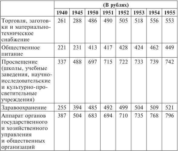 Статистическая таблица ЦСУ СССР «Среднемесячная денежная заработная плата рабочих и служащих по отраслям народного хозяйства СССР в 1940, 1945, 1950–1955 гг.»