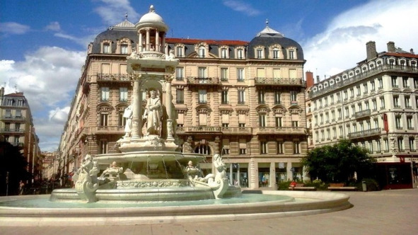 Зато архитектурное сооружение на площади Якобинцев, которое мы хорошо видели из кафе, поедая траву с макаронами, не оставило нас равнодушными. Это великолепный памятник-фонтан с надписью: «От Лиона тем, кто его создавал». Он запечатлел выдающихся мастеров-горожан Лиона, вложивших свой труд в создание этого богатого, живописного города в разные исторические эпохи.