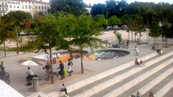 Сразу за мостом – уютная прогулочная зона со скейт-парком, в котором экстремалы удивляют прохожих своими трюками на скейтбордах. Чем дальше мы удалялись от сердца Лиона, тем заметнее проявлялся переход от роскоши старинного города к безликим современным кварталам. Однотипные многоэтажки, однообразная архитектура 70-х входила в резкий контраст с изысканной красотой и богатством исторического центра Лиона.