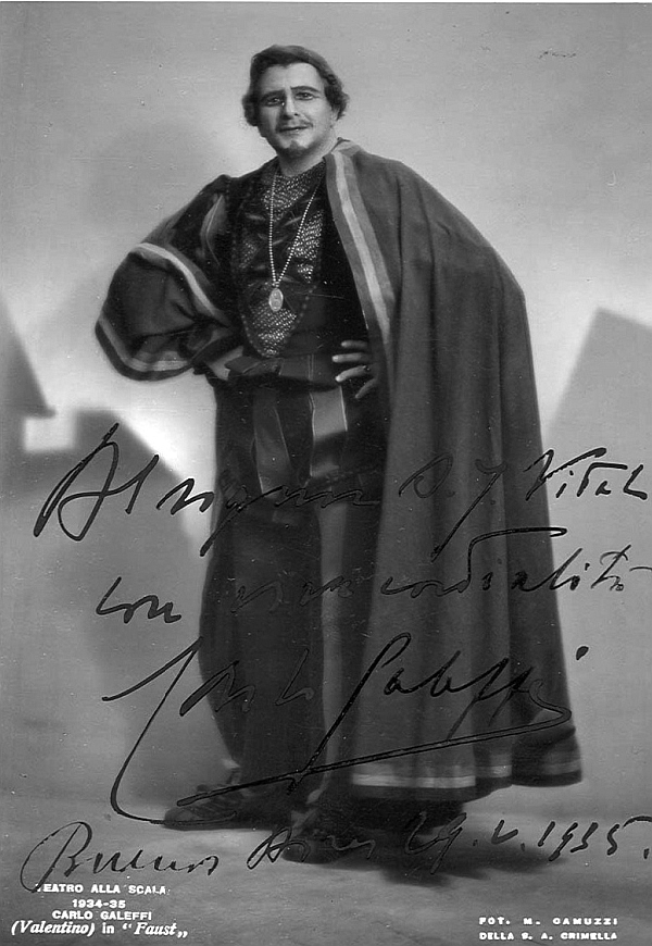 Великий Артуро Тосканини любил и ценил Карло Галеффи. Он считал его лучшим баритоном своего времени, одним из светил оперной сцены. Добавлю, что в течение целого десятилетия Карло Галеффи считался первым баритоном миланского театра «Ла Скала».